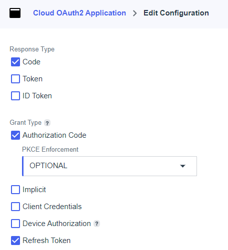 Authorization Code. Also, in the PKCE Enforcement field, select OPTIONAL.