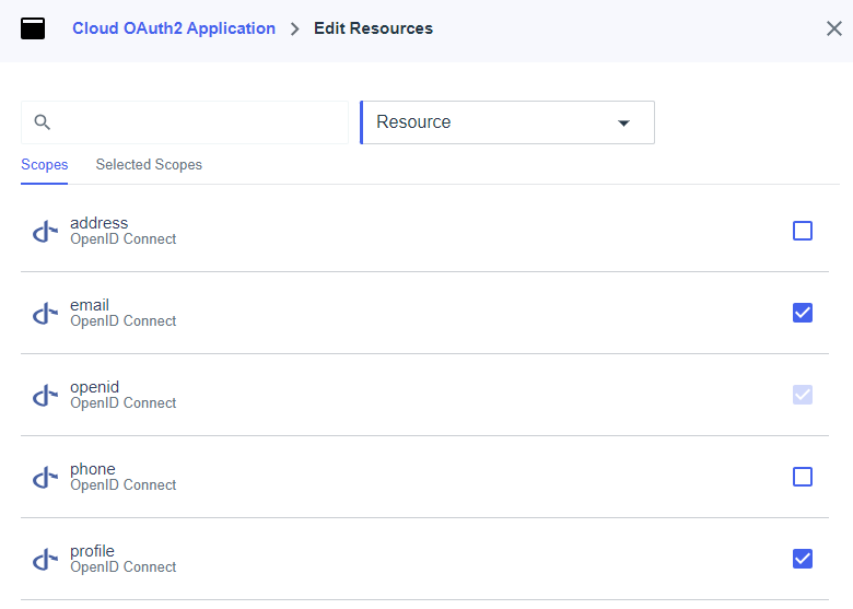 Once saved, click the Resources tab, then click the pencil icon to edit it. Enable the following scopes:
