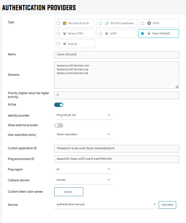 In Domains, list all of the domains present in your PingID environment that will need to authenticate to PMC. For example, to allow user john.doe@acme.com to log in via this Authentication provider, enter the acme.com domain here.