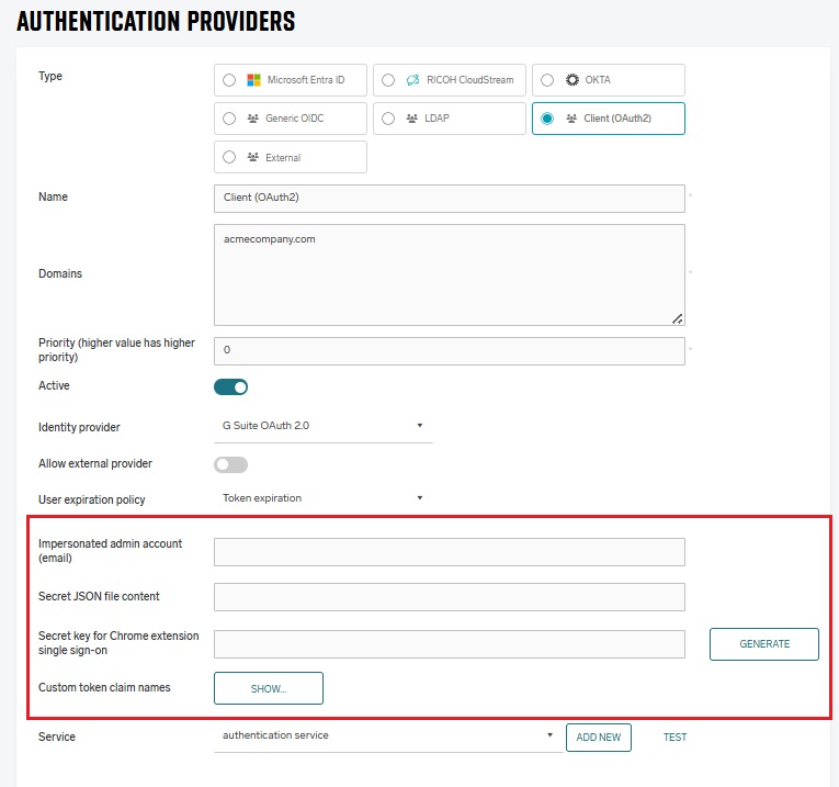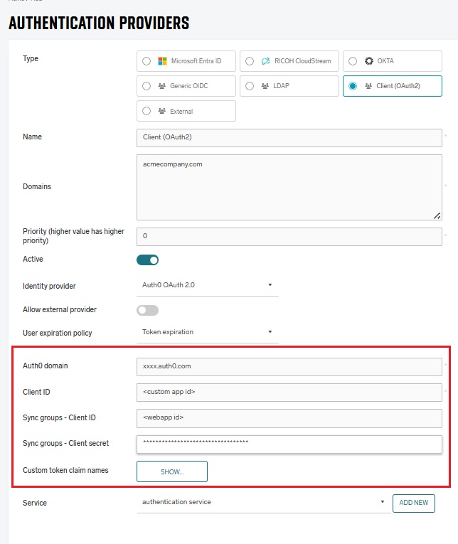 Service – choose authentication service in this field. In case no service is already created, it can be added using the Add button.