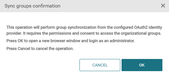 For Microsoft Entra or Ping Identity, the group sync requires an OAuth2-based workflow. By clicking Sync groups, a confirmation window will appear: