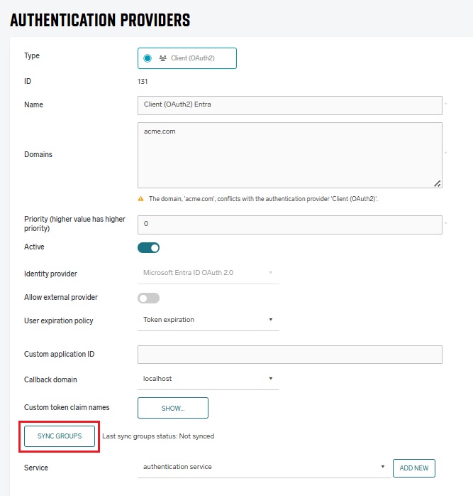 When a new Client authentication provider is created it will have a default group added called Authenticated Users. To synchronize more groups, click Sync groups in the provider view.
