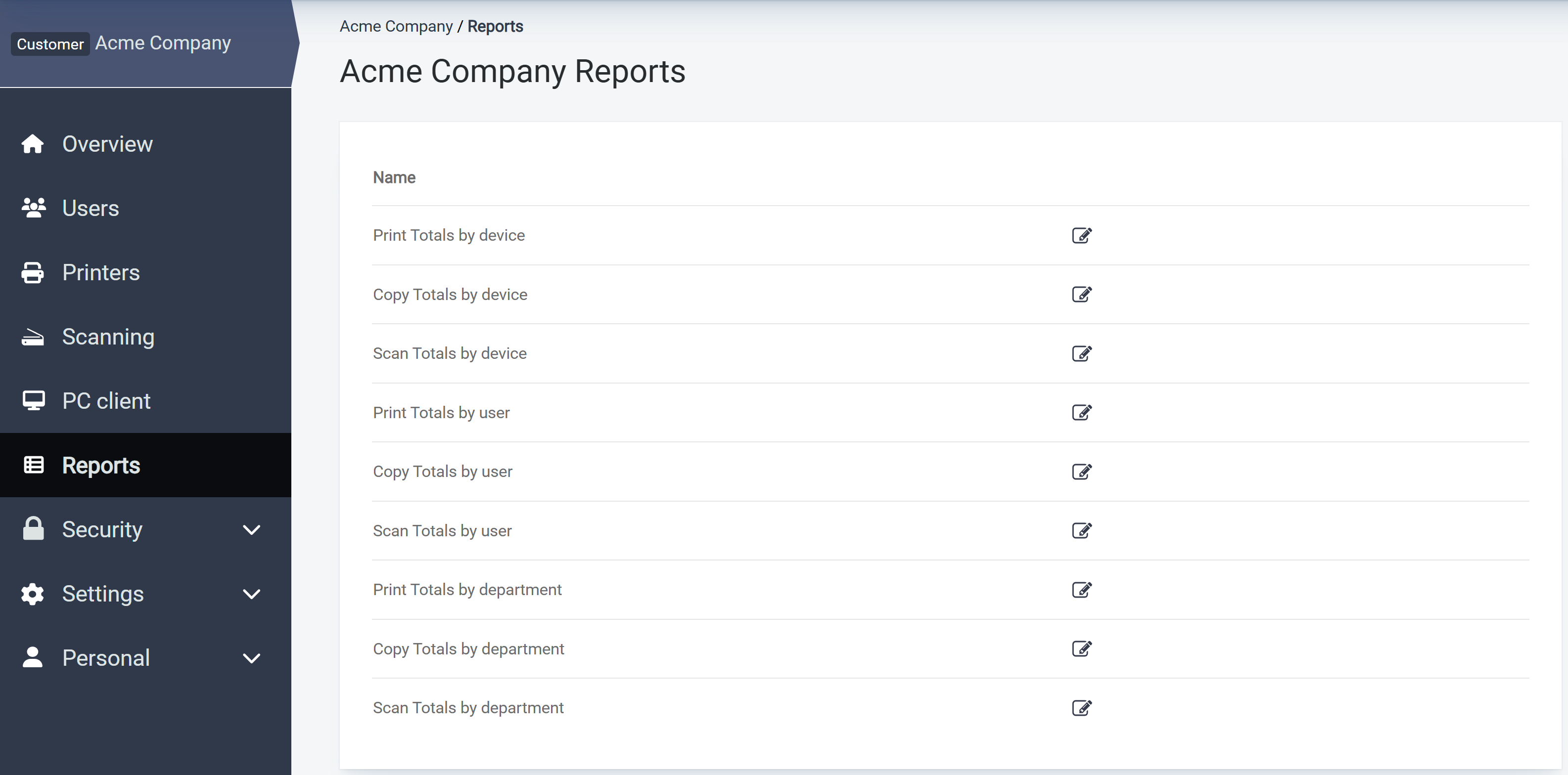 RICOH PMC includes high level reports to show printed output by user, by device, or by department. You can view the reports in your browser or export them to Excel, PDF, or CSV.