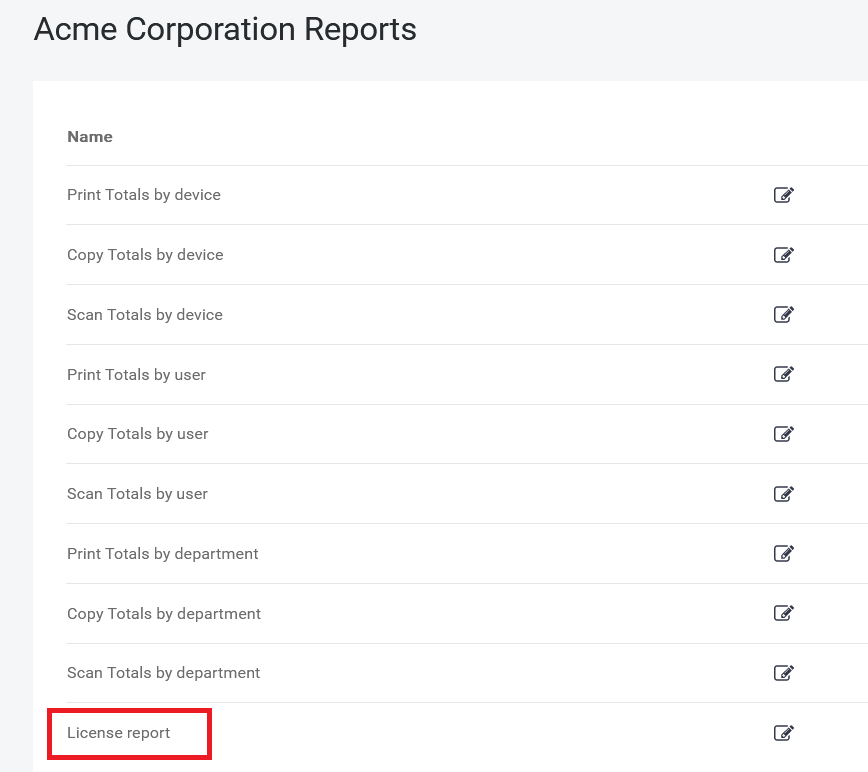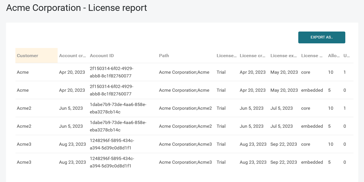 For Vendor accounts, the list also contains the License report. This provides an overview of all customers that belong to your Vendor account, and their licenses.
