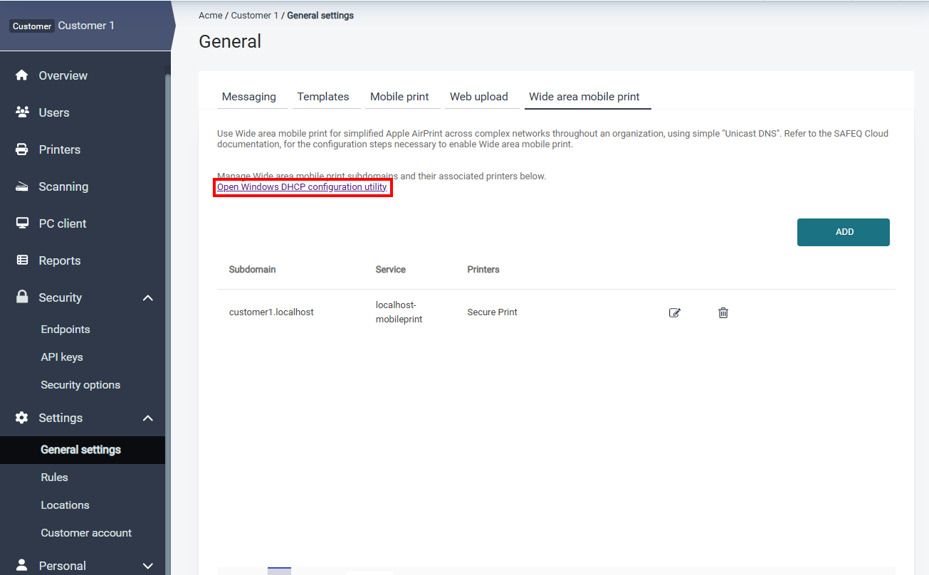 - In the PMC Administrator interface, go to Settings > General settings, tab Wide area mobile print and click the Windows DHCP Configuration Utility