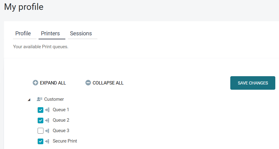 You will see all available Print queues in an expandable tree based on the object tree structure (containers, etc) with the first level expanded. You can expand all or collapse the tree view items using the Expand all and Collapse all buttons.