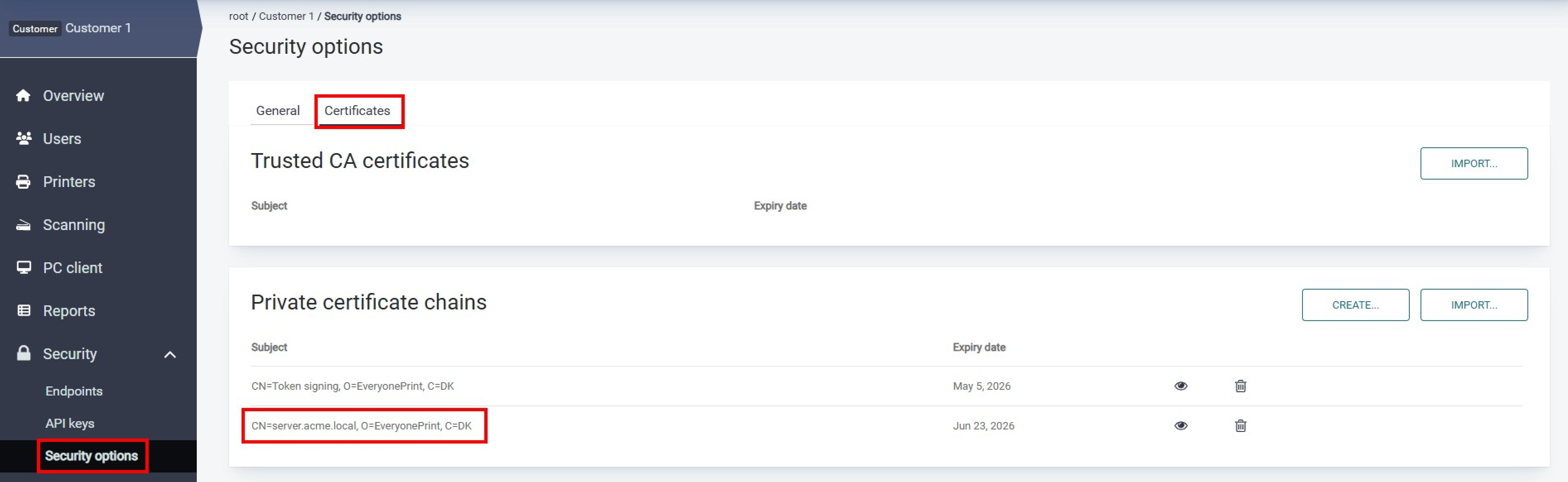 Log in to the PMC Web UI. Go to Security > Security Options and select tab Certificates.