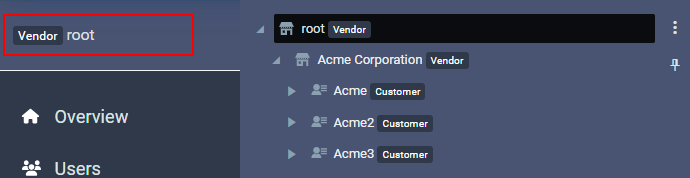 Vendor administrators can navigate between individual customer tenants by hovering over the name of their vendor account in the navigation menu. This will display the PMC system tree. Once you click the customer tenant name in the right part of the tree, the left part of the menu will display information related to that customer, and the right part will be hidden until you hover over the top of the menu again.