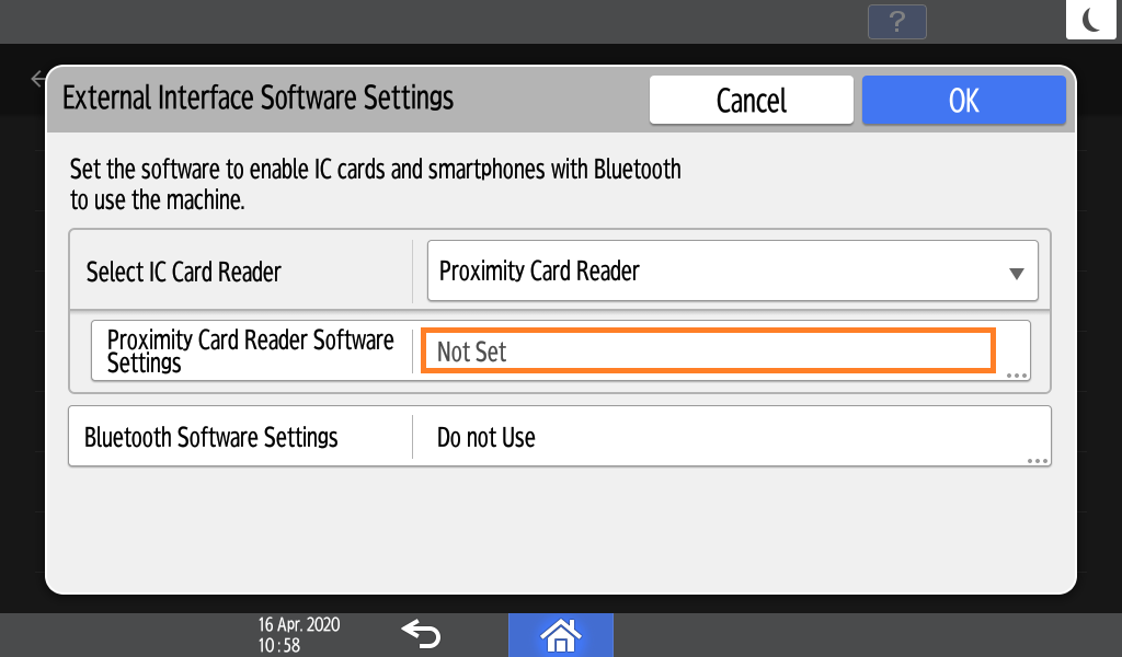 - Navigate to User Tools / Settings > Screen Features > Screen Device Settings > IC Card Bluetooth Software Settings / External Interface Software Settings > Select IC Card Reader.