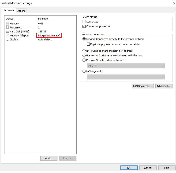 Network – Make sure the network adapter is set to Bridged Mode to ensure the appliance has direct access to the network.