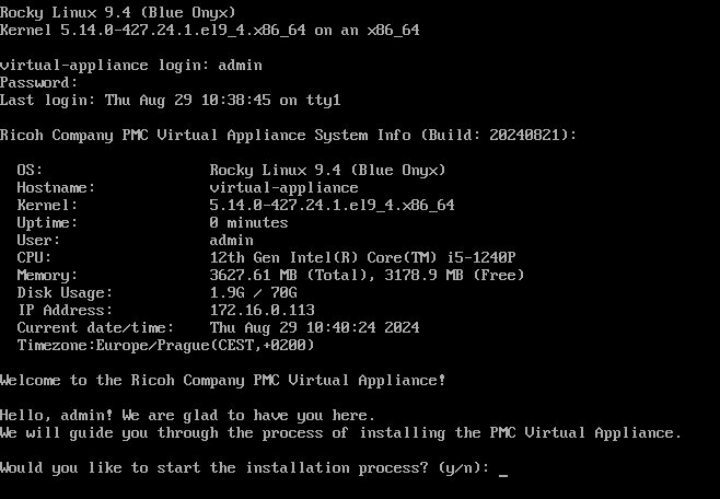 From here, you can continue the installation in your VM manager or remotely connect to the appliance using an SSH client such as MobaXterm or PuTTY (see the Complementary Information section) with the username admin and your new password.