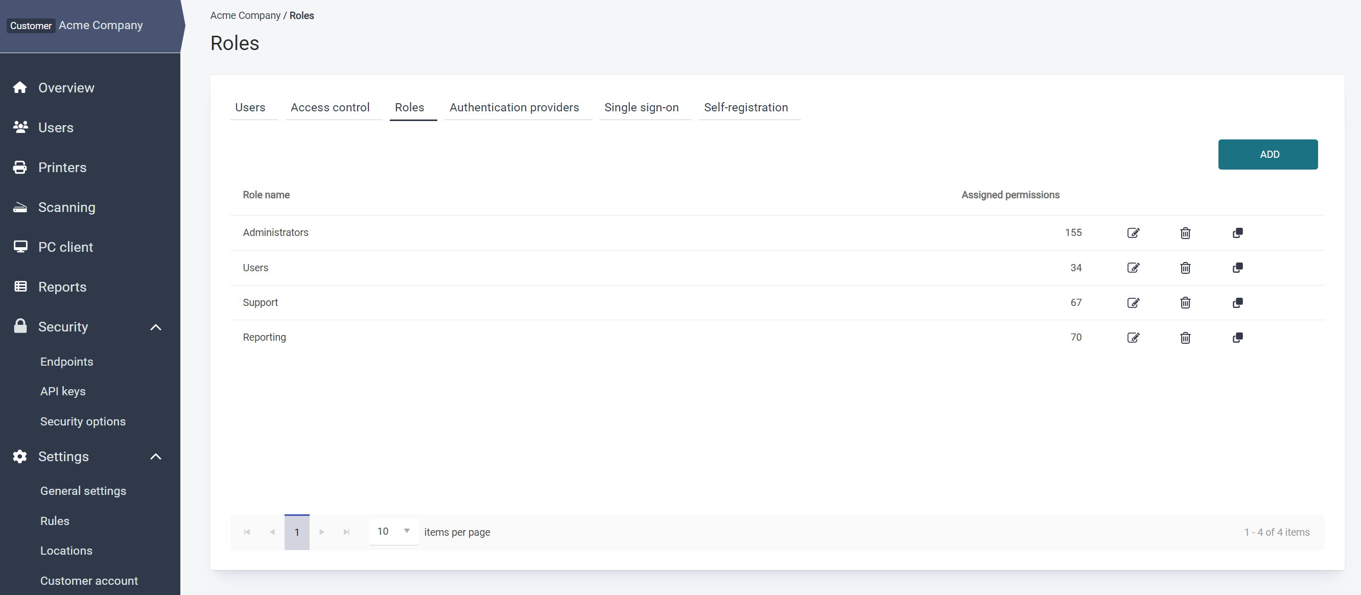 RICOH PMC has four default security roles. You can modify these roles, or create new one based on the types of users that will access the system. Roles exist at each account level in the system.