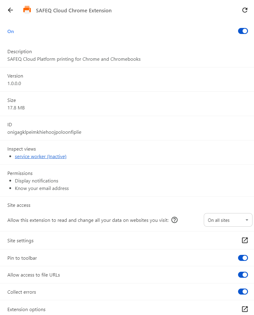 To see info about the extension, go to chrome://extension and find the SAFEQ Cloud extension.