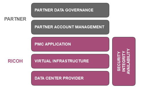 Ricoh and its Partners are jointly responsible for the security of their customers’ print infrastructure. PMC can be hosted either by Ricoh, by a Partner (within a Data Centre selected by Partner), or by the Customer.