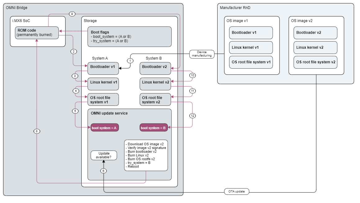 The OMNI Bridge device is designed so that only OS images signed by the manufacturer can be booted on the device.