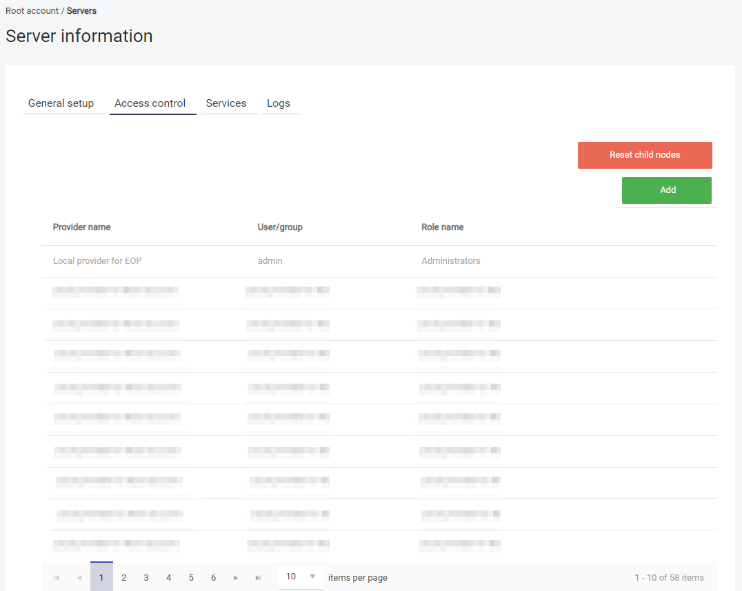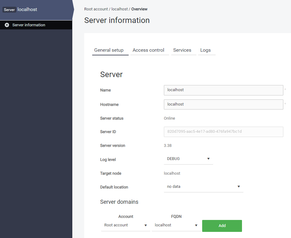 The Access control section allows you to manage permissions for accessing this server. For more details on Access control settings, see section Access Control.