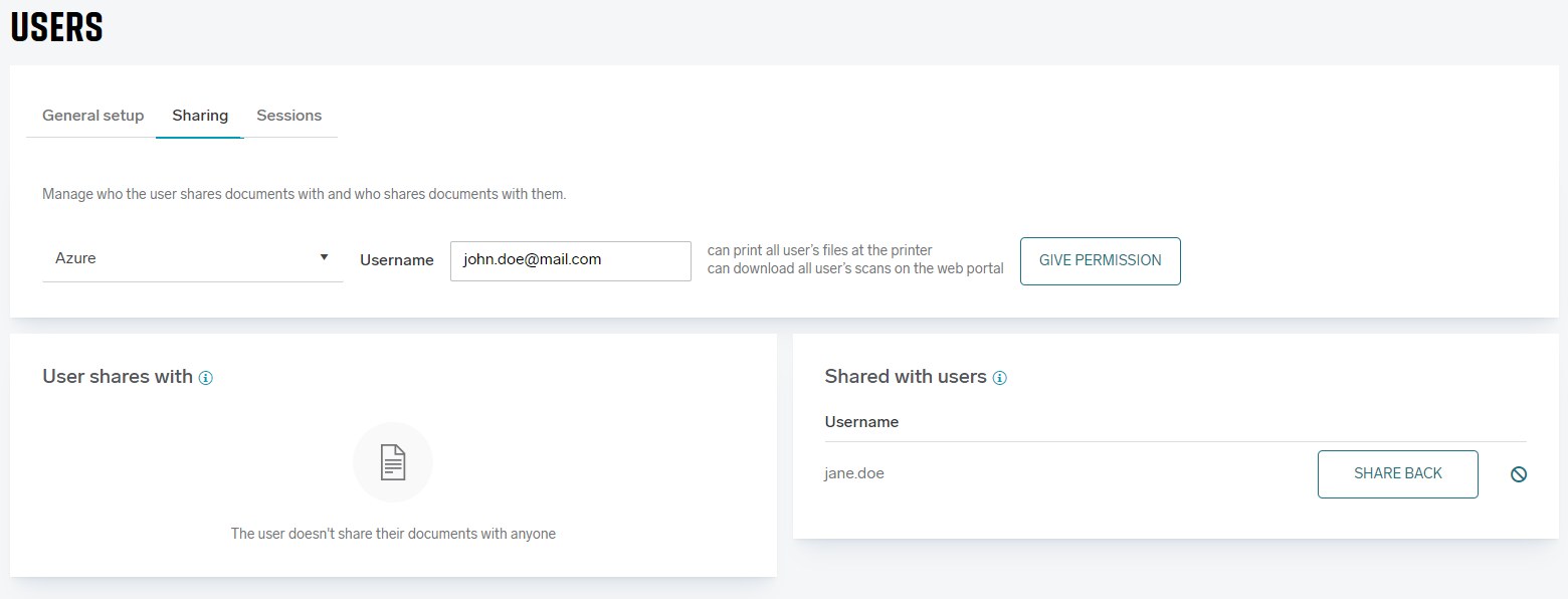 You can add users with whom you want the edited user to share their documents by selecting authentication provider, typing username and clicking on Give permission button.