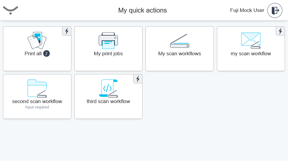My quick actions application enables you to access frequently used functions, such as print all jobs or use a scan workflow immediately after login. The quick action buttons are displayed according to your rights and scan workflows assigned to you.