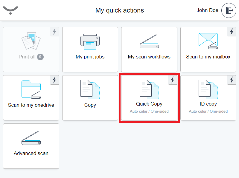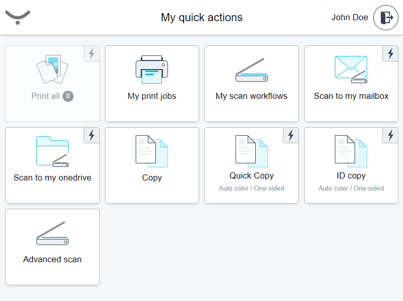 My quick actions application enables you to access frequently used functions, such as print all jobs or use a scan workflow immediately after logging in. The quick action buttons are displayed according to your rights and scan workflows assigned to you.