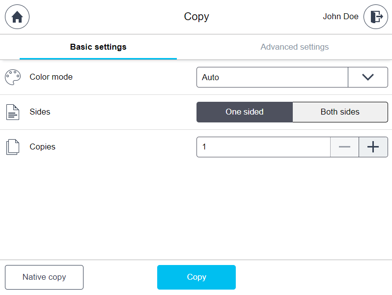 If you need more settings, tap the Advanced settings tab and adjust Paper tray, Paper size, Density, Original -> Output, Combine, Staple mode, Staple position, Staple angle, Zoom, Hole punch mode, and Hole punch position as needed.
